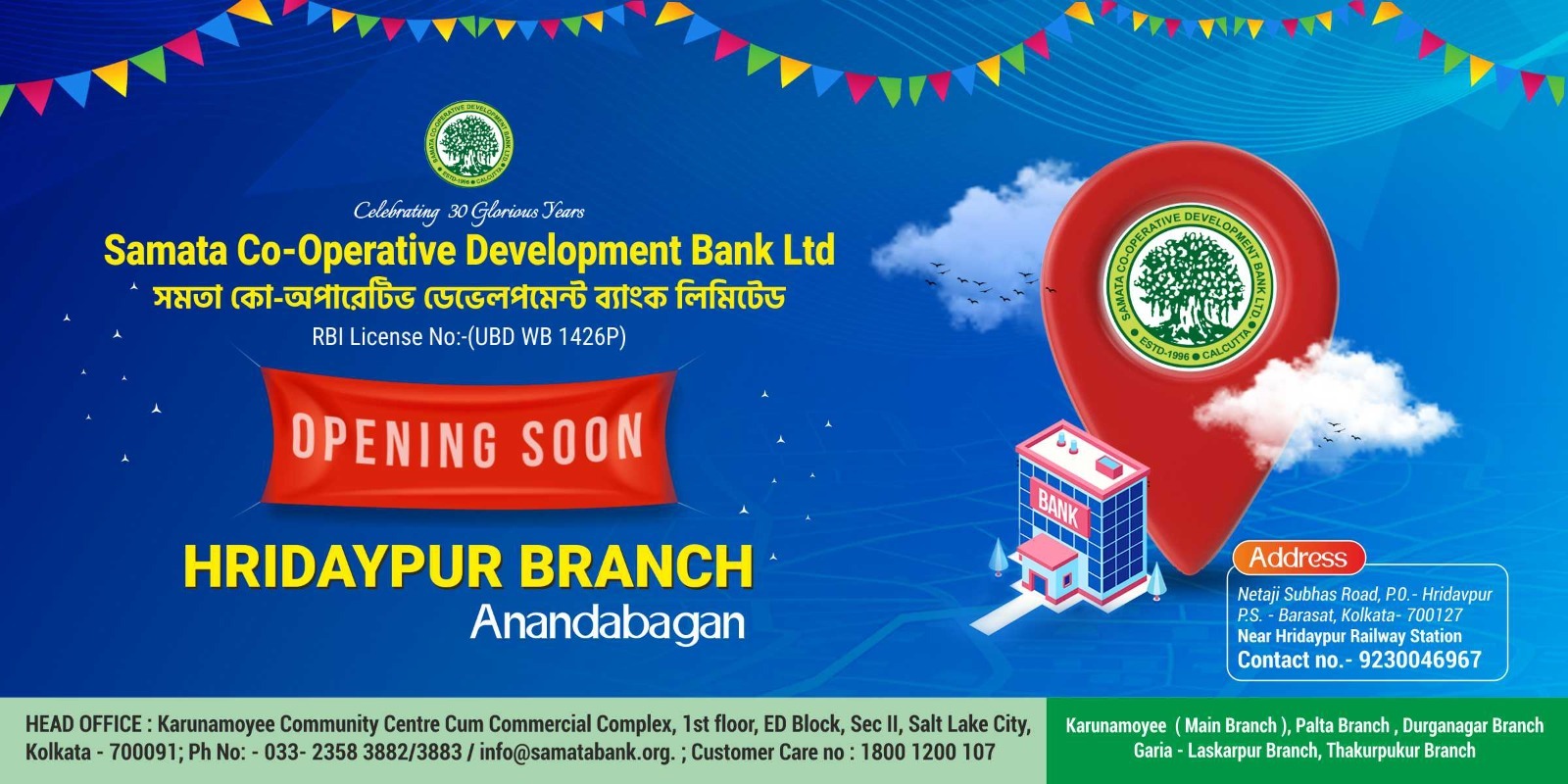 Samata Co-operative Development Bank Ltd is one of the leading Urban Co-operative Banks in the state of West Bengal with its area of operation extends throughout Kolkata Metropolitan area and entire municipal limits of North & South 24 Parganas and some Municipal areas of surrounding districts in the State of West Bengal.
